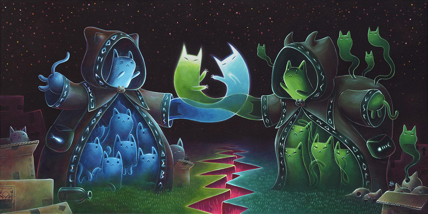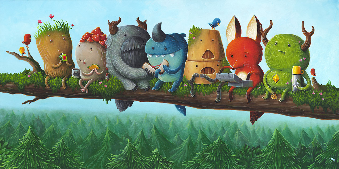 Thanks for visiting my online gallery and store. My name is Justin Hillgrove and I am a Pacific Northwest artist. I love painting monsters, robots and cats, and am happiest when I am in my studio listening to a good book and putting brush to canvas. Explore my paintings, drawings, sketches, books, and more by selecting "Art" in the menu above.