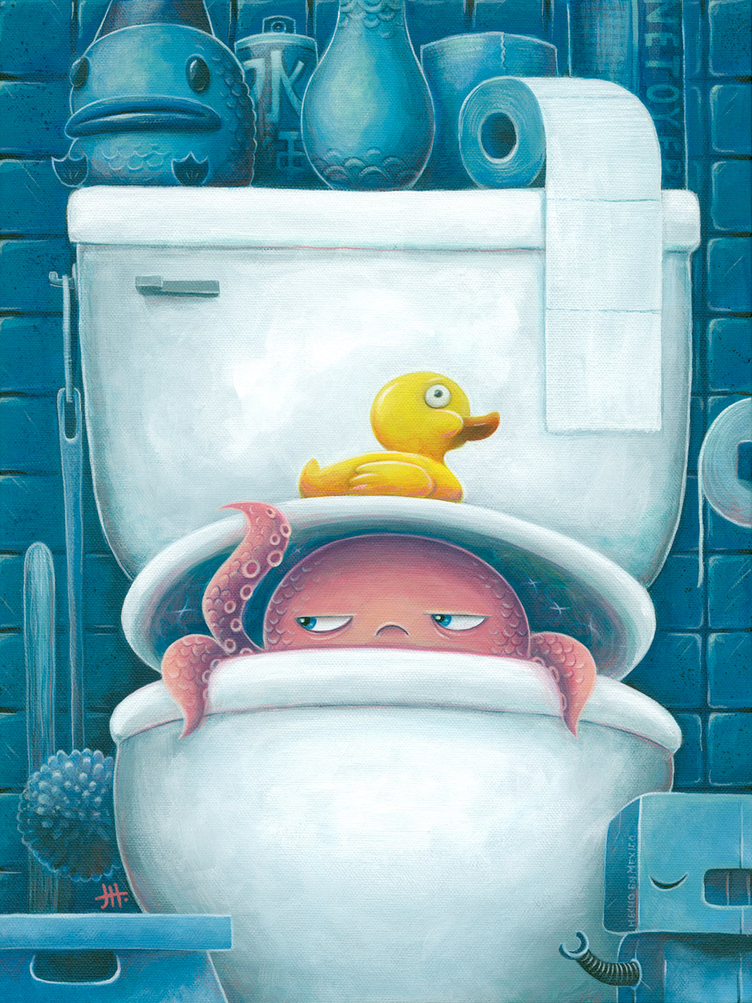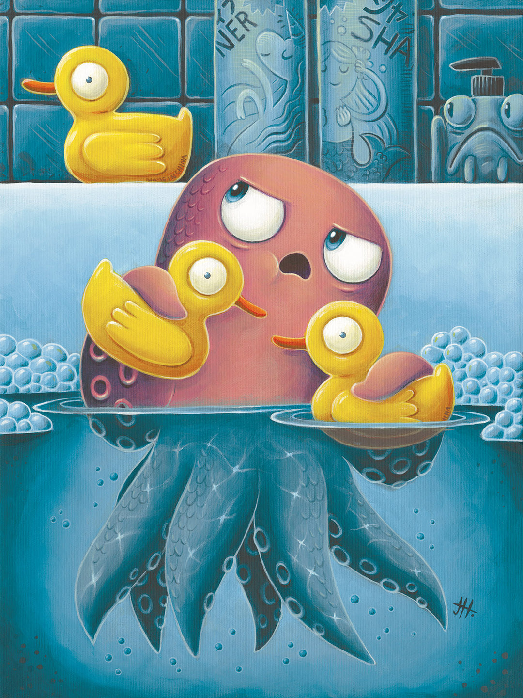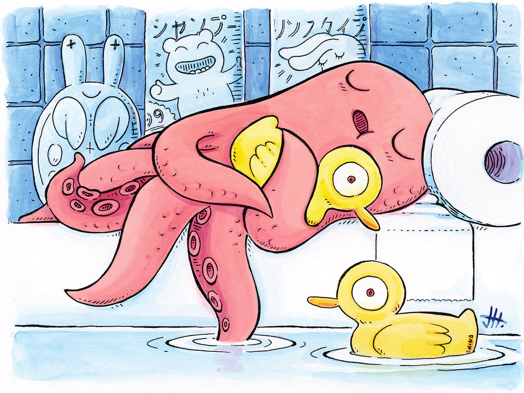 Dive into the quirky world of Pacific Northwest artist Justin Hillgrove and his original character, Arthur—a neurotic octopus navigating the emotional highs and lows of life in the bathroom. Caught in a turbulent tango with a host of rubber ducks calmly defending their watery domain, Arthur’s misadventures are a hilarious and heartfelt exploration of his endless anxieties and questionable choices. A splash of chaos, a dash of whimsy, and plenty of tentacles await! Art prints that add charm to any wall—even the most essential space in your home: the bathroom!