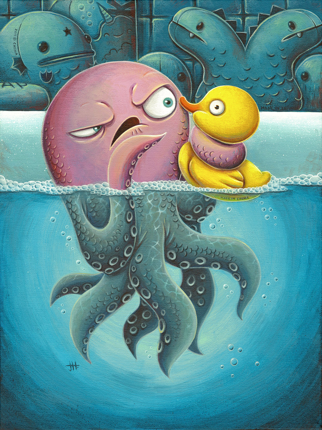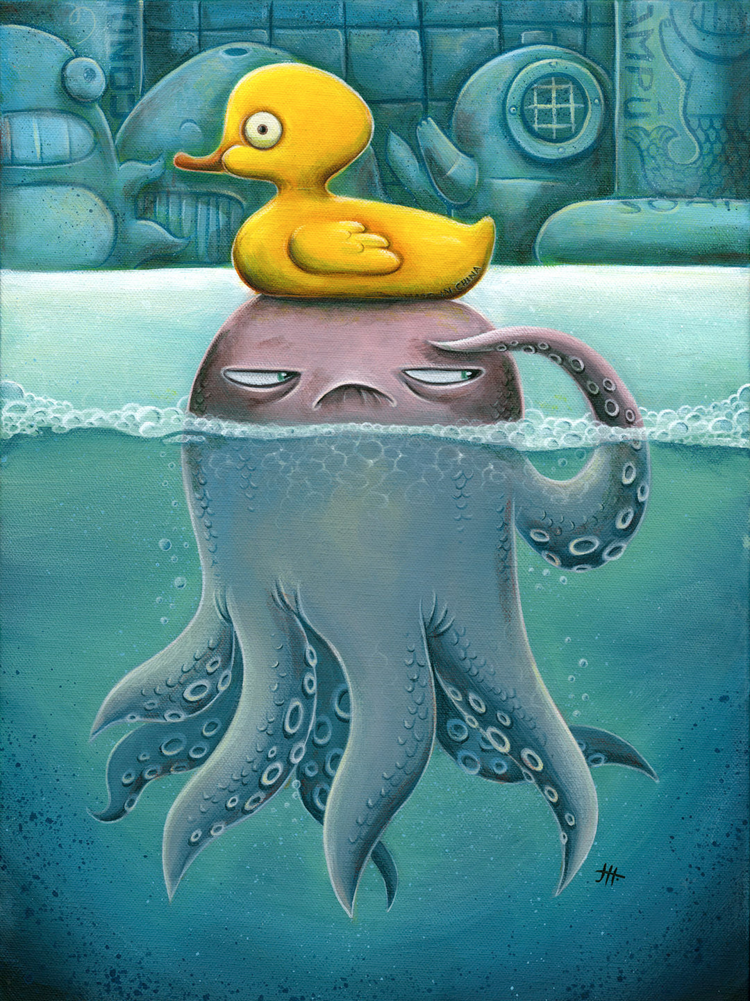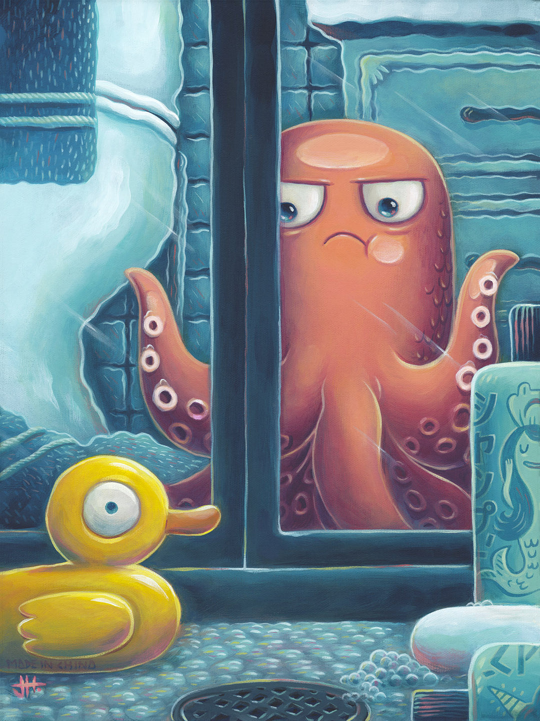 Dive into the quirky world of Pacific Northwest artist Justin Hillgrove and his original character, Arthur—a neurotic octopus navigating the emotional highs and lows of life in the bathroom. Caught in a turbulent tango with a host of rubber ducks calmly defending their watery domain, Arthur’s misadventures are a hilarious and heartfelt exploration of his endless anxieties and questionable choices. A splash of chaos, a dash of whimsy, and plenty of tentacles await! Art prints that add charm to any wall—even the most essential space in your home: the bathroom!